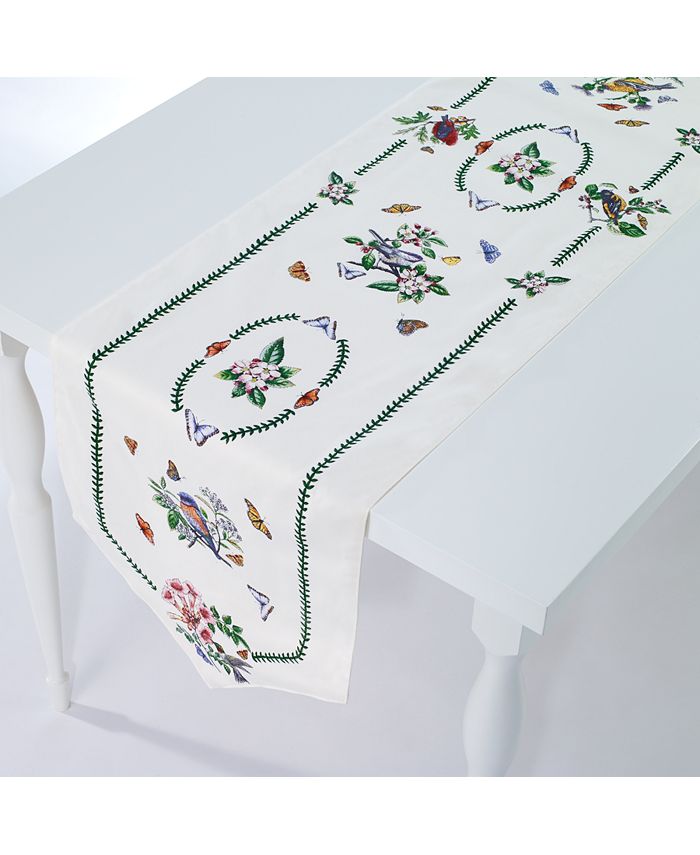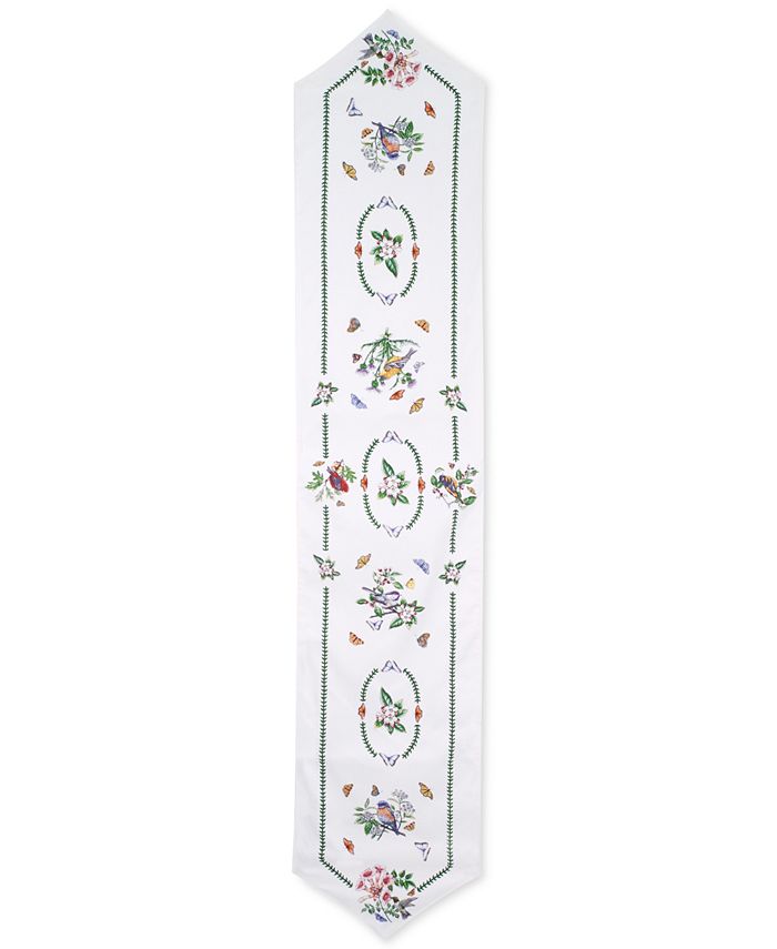 Fine feathered friends linger along the length of Portmeirion’s Botanic Birds table runner that’s brightened with blooms and butterflies.