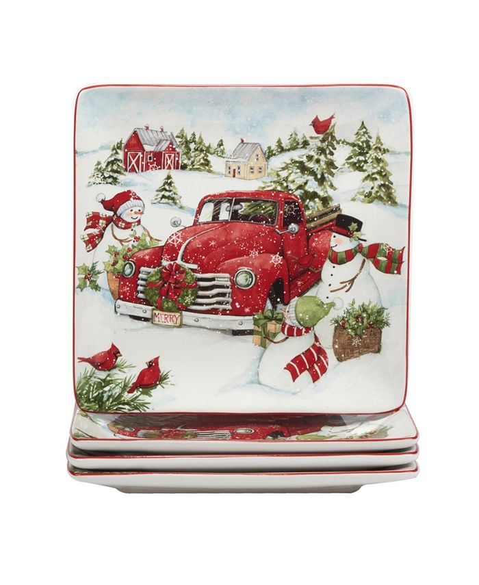 Celebrate the holiday season with Certified International’s Red Truck Snowman dinner plates designed by artist Susan Winget. A snowy scene of smiling snowmen alongside a shiny red truck loaded with their holiday tree decorates every ceramic plate.