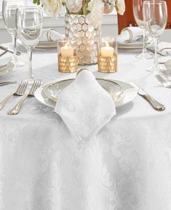 Metallic printed holiday icons on a white background is a chic and contemporary way to add Christmas cheer to your home. These tablecloths are perfect for holidays, dinners, and more. These tablecloths have a 1″ folded hem and mitered corners.