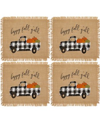 Stylish, rustic and beautiful the Farmhouse Living Collection offers everything you need to create the shabby chic, modern country home. These fashionable fall inspired placemats are made from premium quality fabrications and feature a trendy vintage truck in buffalo check with pumpkins and “happy fall y’all” statement. Excellent for special occasions, events, parties, and everyday décor use during the fall season. Fringe edges add style and charm. Sold as a set of four placemats measuring 13×19 each. Coordinate to all the items in our Farmhouse Living collection including tablecloths, placemats, pot holders, kitchen towels, kitchen mats and window treatments. 100% burlap. Spot clean only.
