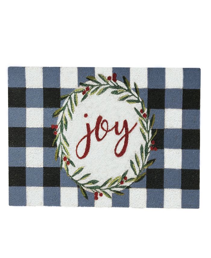 This novelty print and statement door mat is made of natural coir and features an adorable holiday print with a wreath, black and white plaid, and “joy” wording. Perfect welcome mat for use all holiday season. Thick and durable coir fibers are great for wiping feet and for high traffic areas. Mat measures 18×30. 100% natural coir. Spot clean only.