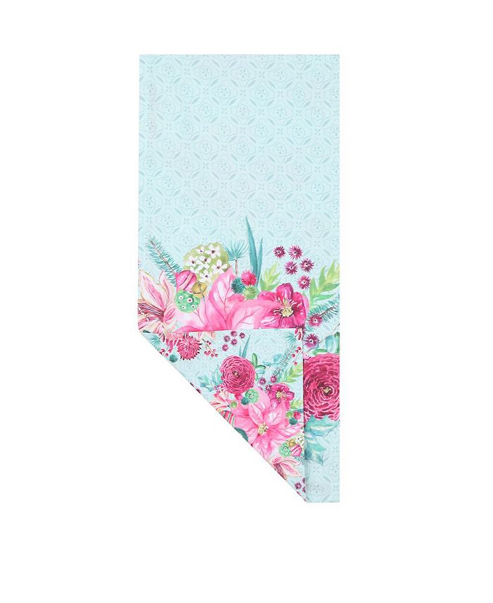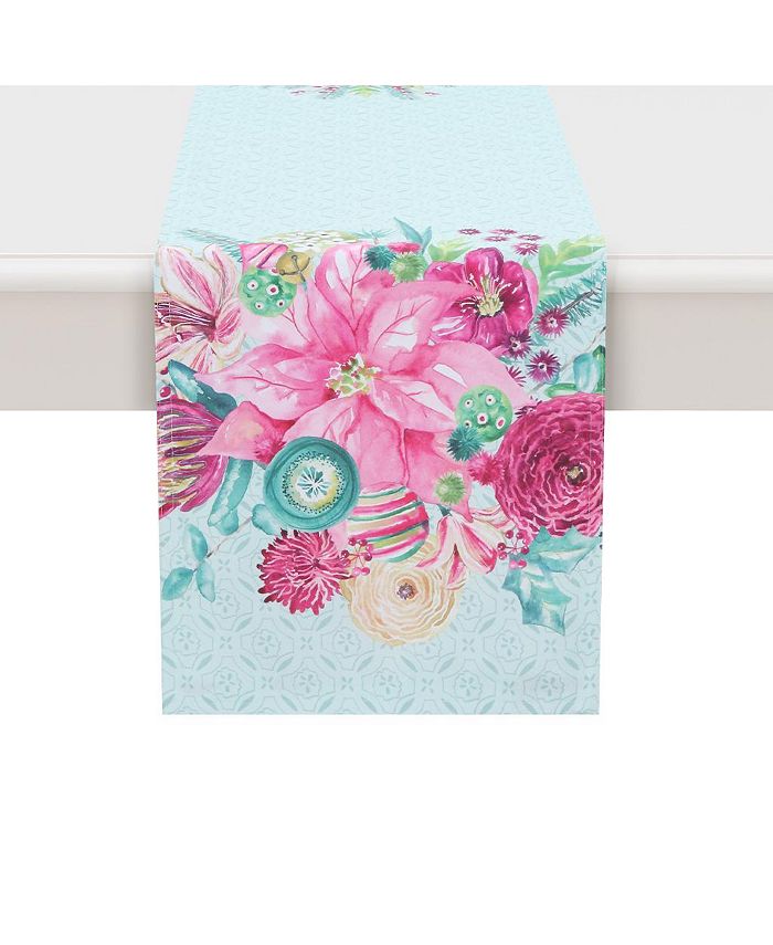 Out with the old, in with the new. This holiday design “Boho Christmas” reversible runner, features a multicolored floral arrangement in dazzling magenta, pink, red, and green hues. The background features a tone-on-tone mint trellis. This runner will add a special touch to your Christmas table.