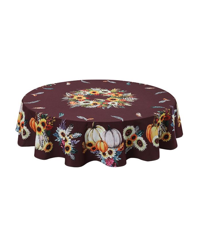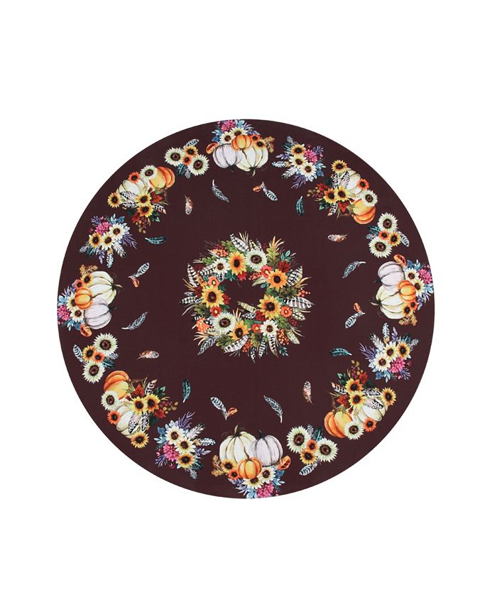 “Fall Feathers” round tablecloth features jewel-toned watercolor flowers, sunflowers, pumpkins, and fun feathers. Positioned in the center is an elegant wreath. The background contrasts the bright colors with a rich maroon-colored decorative pattern of line art flowers and floral silhouettes.