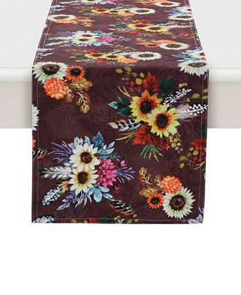 “Fall Feathers” reversible runner features jewel-toned watercolor flowers, sunflowers, pumpkins, and fun feathers. Positioned in the center are three elegant wreaths. The background contrasts the bright colors with a rich maroon-colored decorative pattern of line art flowers and floral silhouettes.