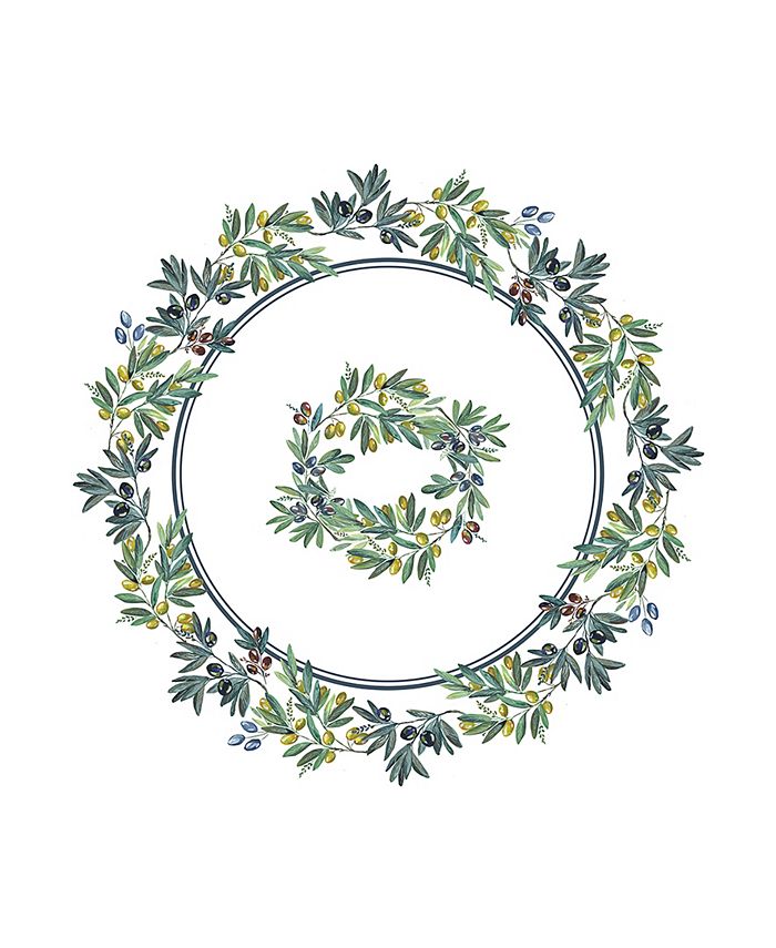 This landscape inspired tablecloth, “Olive Grove,” features beautiful detailed olive branches throughout the border. The design surrounds a hand painted countryside villa with natural hues of greens, purples, browns. Add this soft runner for a unique rustic focal point to your dining space.