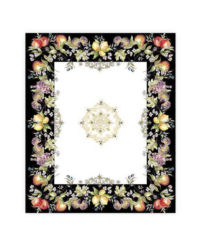 This food-inspired tablecloth “Tuscan Fruit Sketch” features watercolor fruit, pomegranates, lemons, figs, pears, grapes, and a contrasting black background. In addition, the clean white center dazzles with three golden medallions as the focal point.