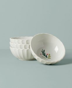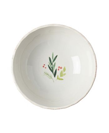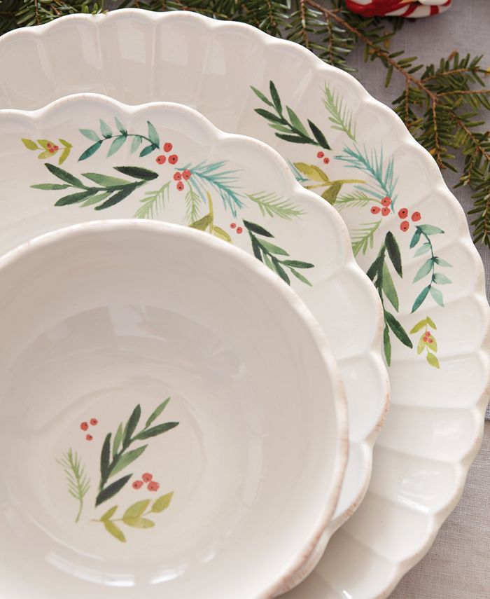 A festive fresh spin on the French Perle favorites. These all purpose bowls feature artistic varieties of holiday holly with leaves, branches, and berries in a handpainted style. Crafted with smooth scallops on a snowy white base for a creative winter feel.
