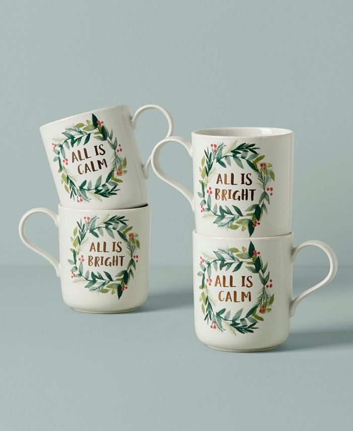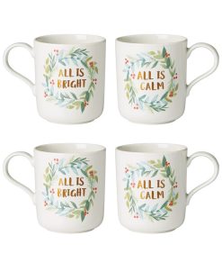 A festive fresh spin on the French Perle favorites. These mugs feature a wreath of artistic holiday holly with leaves, branches, and berries in a handpainted style around the words “All is Bright” and “All is CALM”. Crafted with smooth scallops on a snowy white base for a creative winter feel.