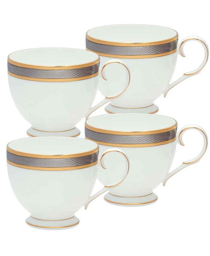 Brilliance features generous applications of etched metal banding in platinum and gold for a rich and elegant look on bone china.