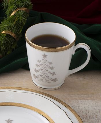 Newly introduced in 2021, the popular charlotta gold tone is a set of holiday accessories. Mugs and accent plates are introduced in 2 different designs. The harvest items feature leaves, pine cones, and berries in bronze, while the tree items showcase a stylized Christmas tree in silvery tone-gray.