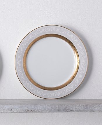 Crestwood gold brings sophisticated elegance to the table. This stunning pattern features crisp bright white porcelain, paired with a gold-tone band for a look of elegant simplicity. The exterior gold-tone band is etched with a design of scrolling leaves.