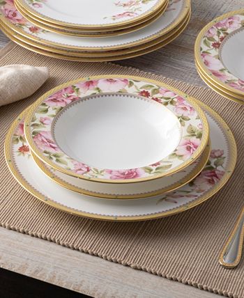 Hertford features a classic floral color palette and design. Pink and red roses cover the rim of the plate, and the design is surrounded by a stunning infinity etching on the stroking gold-tone band. Delicate raised turquoise enamel dots applied to the band create the perfect finishing touch.