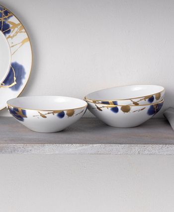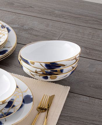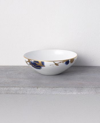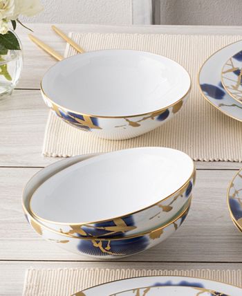 Jubilant days gold is an abstract celebration, featuring a base of random swatches of cobalt blue, and splashes of shimmering gold-tone on white porcelain. Jubilant days gold offers place setting components as well as an array of serving pieces and accessories.