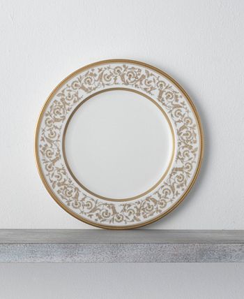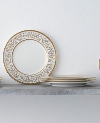 Summit gold is a mix of textures and visuals, pairing traditional and modern elements on bone China. Incorporated for more depth are touches of a finely speckled gray and monochromatic looping floral elements.