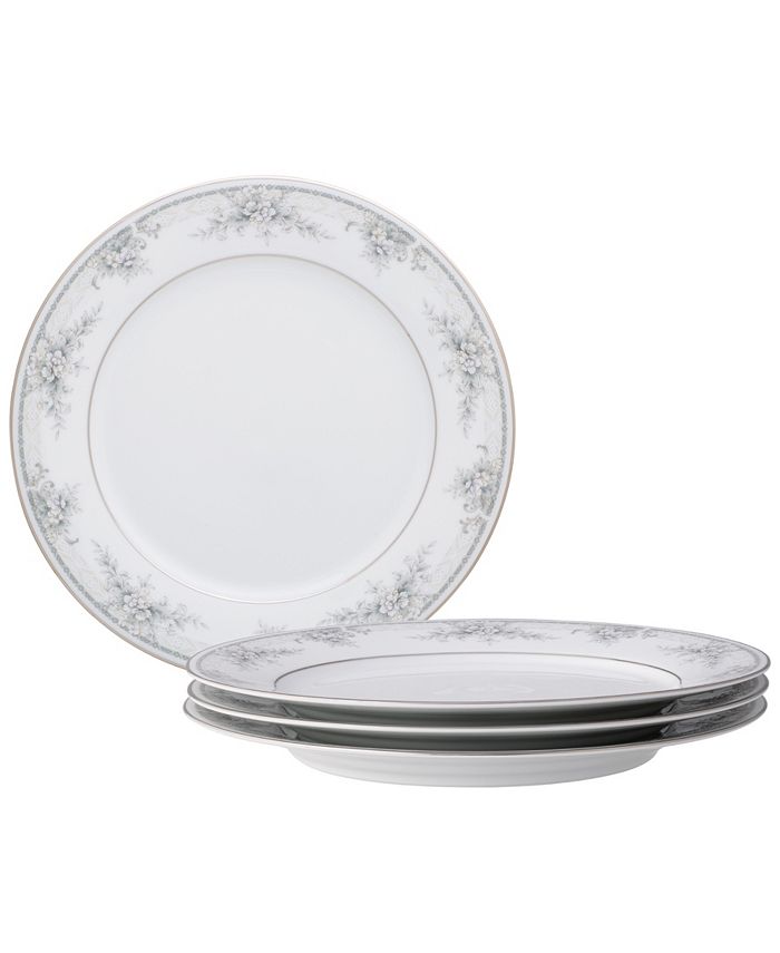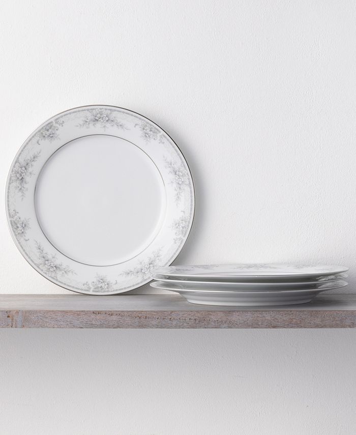 Sweet Leilani features roses in gray and muted pink over a simple trellis of white-on-gray on white porcelain. Bouquets of white and pastel-pink floral with hints of pastel colorations adorn the rim of a lacy, geometric band application, edged in platinum.