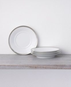 Whiteridge Platinum features multiple design elements. Items crafted in white porcelain feature ultrafine white-on-white raised ridges, which on selected items are alternated with a light grey. The wide outer platinum band is etched with waves flowing around the edge of each piece.