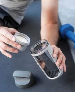 Take your protein shake or supplements on the go with this shake bottle with powder compartment. The powder container screws into the lid, no need to keep track of your bottle and supplements. The wide mouth on the bottle lets you easily pour your powders and the mixing ball blends with ease.
