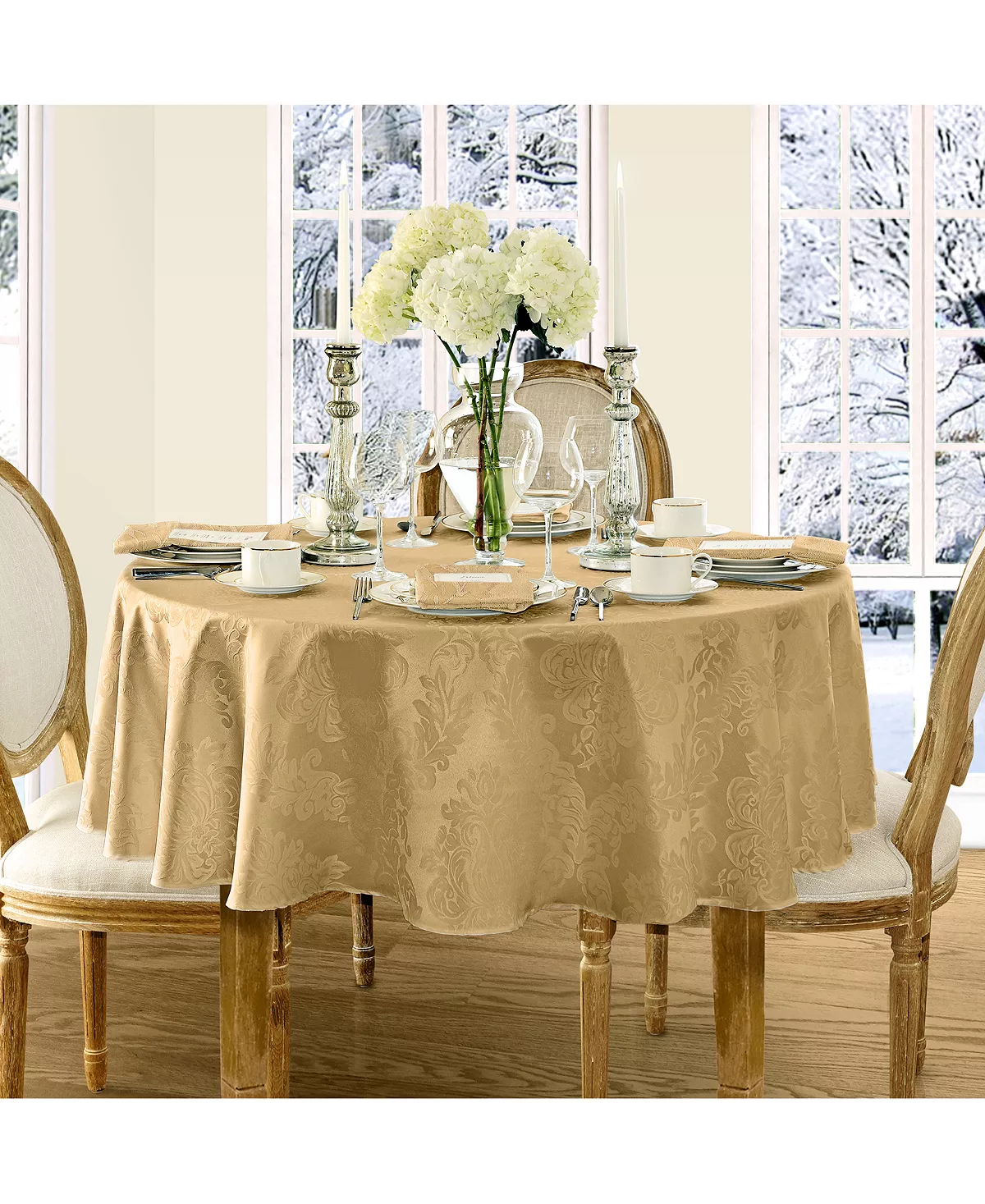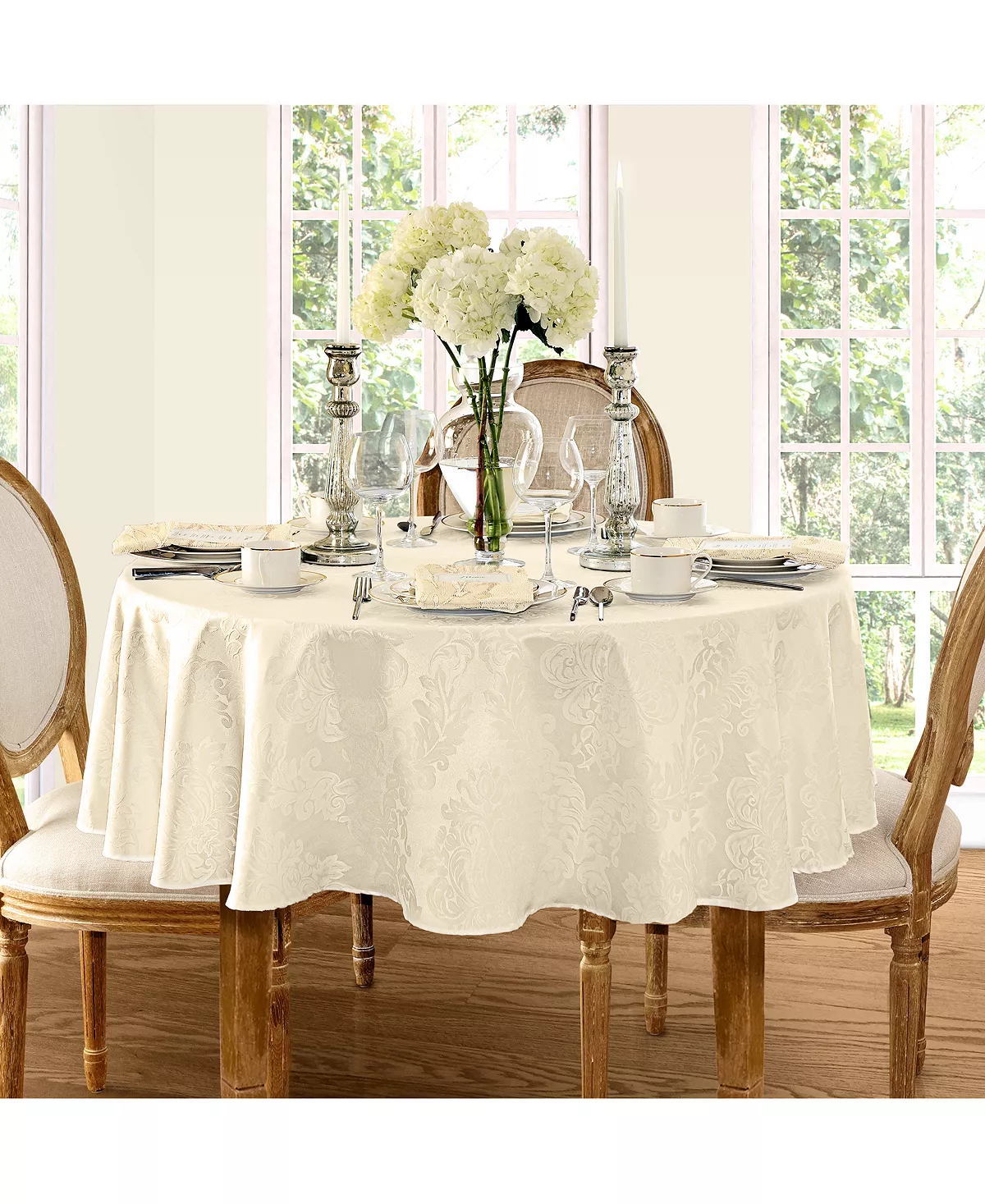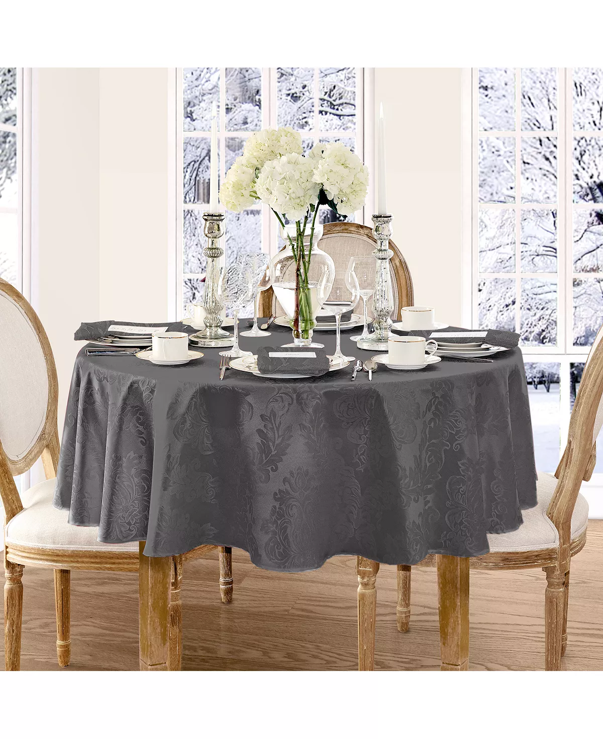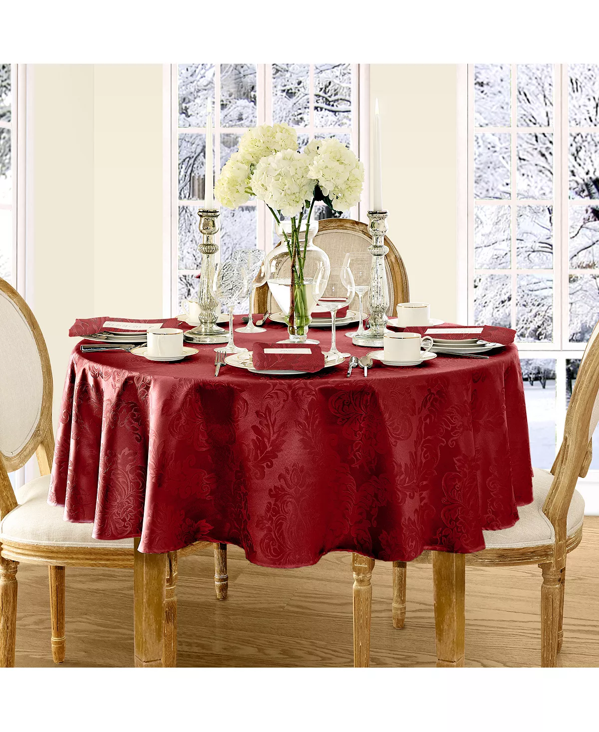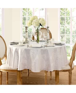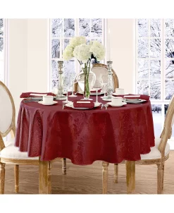 The Barcelona Damask table linens collection features a regal damask design in eight different rich, solid colors. 100% Polyester. Machine wash and dry. Made in China.
