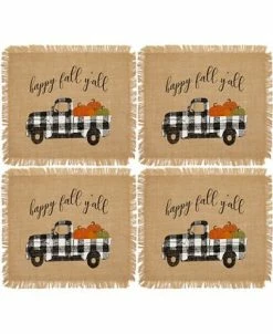 Stylish, rustic and beautiful the Farmhouse Living Collection offers everything you need to create the shabby chic, modern country home. These fashionable fall inspired placemats are made from premium quality fabrications and feature a trendy vintage truck in buffalo check with pumpkins and “happy fall y’all” statement. Excellent for special occasions, events, parties, and everyday décor use during the fall season. Fringe edges add style and charm. Sold as a set of four placemats measuring 13×19 each. Coordinate to all the items in our Farmhouse Living collection including tablecloths, placemats, pot holders, kitchen towels, kitchen mats and window treatments. 100% burlap. Spot clean only.