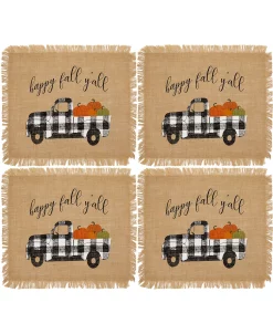 Stylish, rustic and beautiful the Farmhouse Living Collection offers everything you need to create the shabby chic, modern country home. These fashionable fall inspired placemats are made from premium quality fabrications and feature a trendy vintage truck in buffalo check with pumpkins and “happy fall y’all” statement. Excellent for special occasions, events, parties, and everyday décor use during the fall season. Fringe edges add style and charm. Sold as a set of four placemats measuring 13×19 each. Coordinate to all the items in our Farmhouse Living collection including tablecloths, placemats, pot holders, kitchen towels, kitchen mats and window treatments. 100% burlap. Spot clean only.