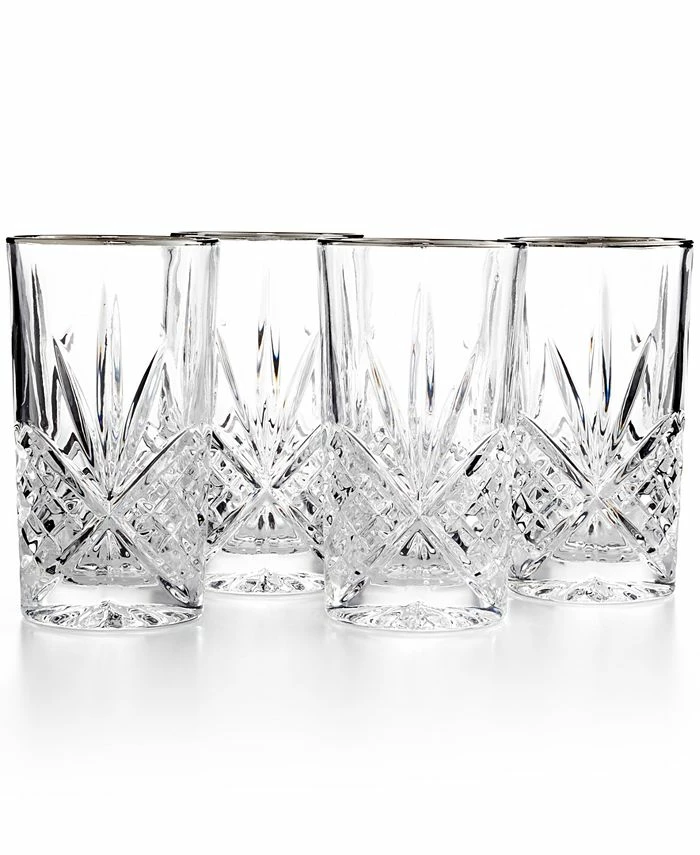 Elevate your formal table with platinum-banded crystal. Long, faceted cuts in a traditional starburst pattern make this set of highball glasses a timeless addition to elegant settings. From Godinger.