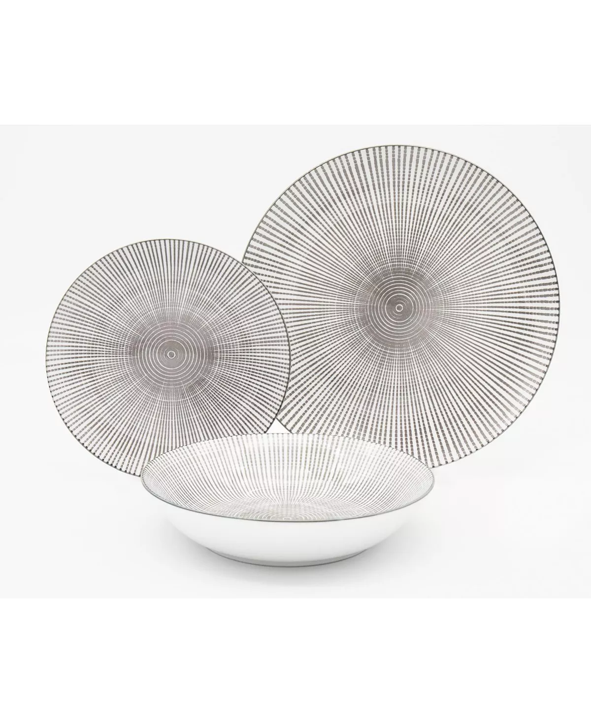 12 piece porcelain set with 4 each: dinner plates, salad plates and bowls. Muted grey center with straight lines flowing through the set