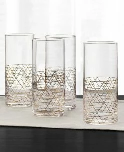 A gold-tone geometric pattern enhances the clear, modern profile of Hotel Collection’s set of Gold Decal highball glasses.