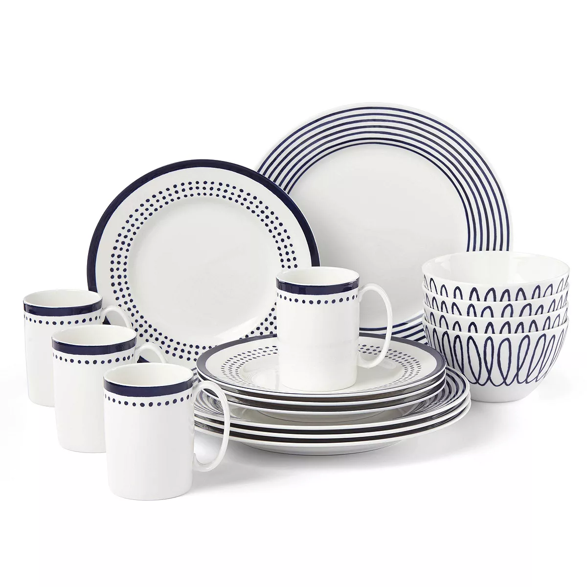 Give your table a touch of city chic in gleaming white porcelain with the Charlotte Street East 16pc Set. Inspired by one of London’s most celebrated historic districts, this pattern reflects a cosmopolitan sensibility in simple Navy Blue and White. Dinner plates with stripe design, accent plate with dot & band design, soup/cereal bowl with squiggle design and mug with stripe and dot design. Set includes (4) Four each: dinner plates, accent plates, soup/cereal bowl and mug. Dishwasher and Microwave Safe.