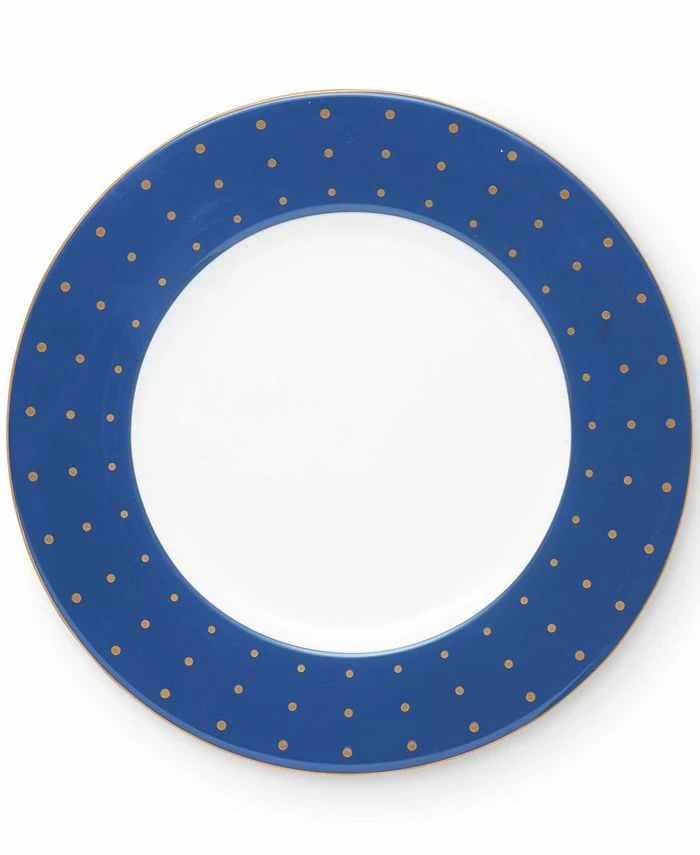 Set the table with poise and purpose. The Library Lane accent plate features a bold navy band with small gold polka dots.