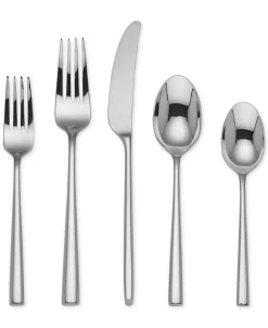 - Includes dinner fork, dinner knife, soup spoon, salad fork, and tea spoon