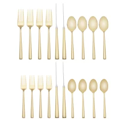 The Malmo GOLD 20pc set from kate spade redefines modern tabletop style with precision lines and uniquely sloping, tube-like handles. The unique utensil design lets the knife rest on its edge and makes it easier to handle. Set includes FOUR (4) of each: Dinner knife, Dinner Fork, Soup Spoon, Salad Fork & Tea Spoon. Made of Gold Plated Metals.
