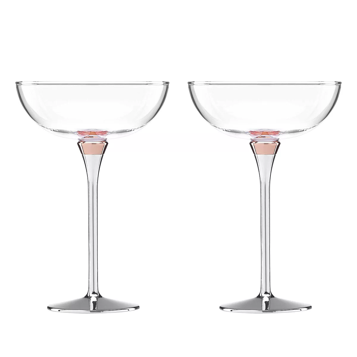 Dressed with rose gold accents, the kate spade new york Rosy Glow Collection features frames, flutes and serving sets. Designed to celebrate weddings, anniversaries and other romantic occasions. The new Champagne Saucer Pair features a cupe bowl, silver-plated stems and a rose gold accent between the bowl & the top of the stem. Makes a great gift for the new couple