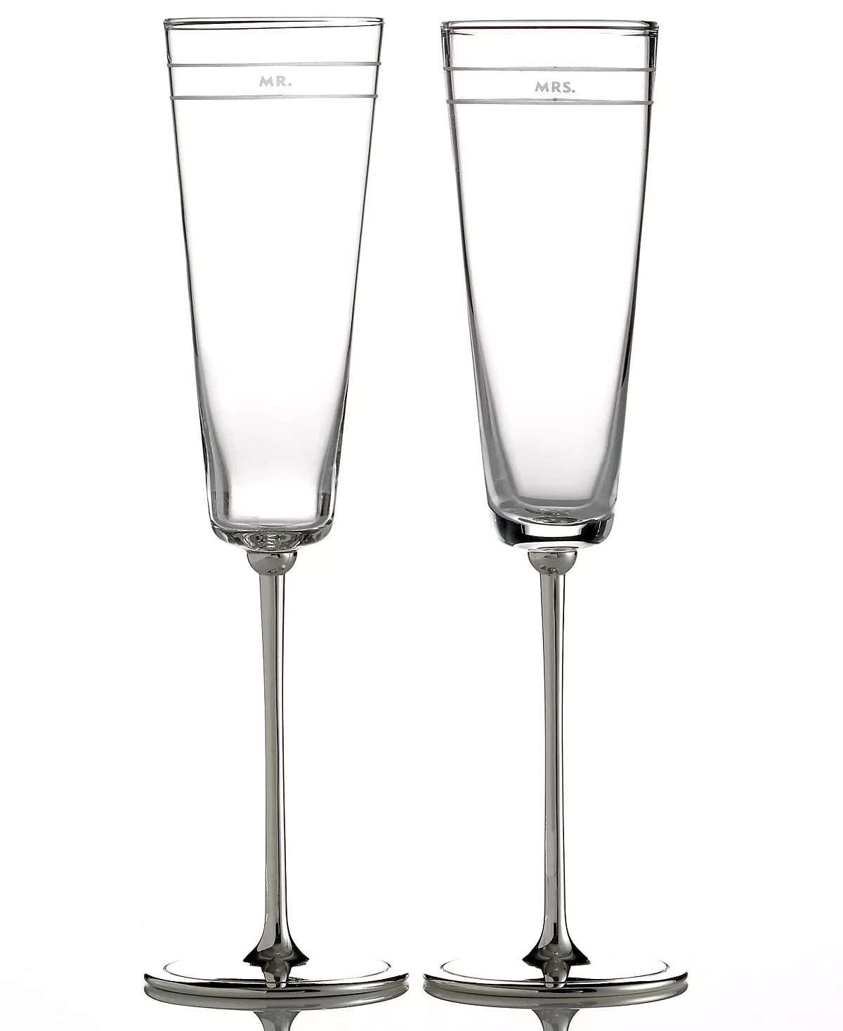 Begin a glorious meal–and life–together with a magical toast. From kate spade, these crystal champagne glasses feature brilliant silver-plated stems and sheer bands with either “Mr.” or “Mrs.” engraved on each rim. Coordinates with the rest of the handsome and modern Darling Point collection.