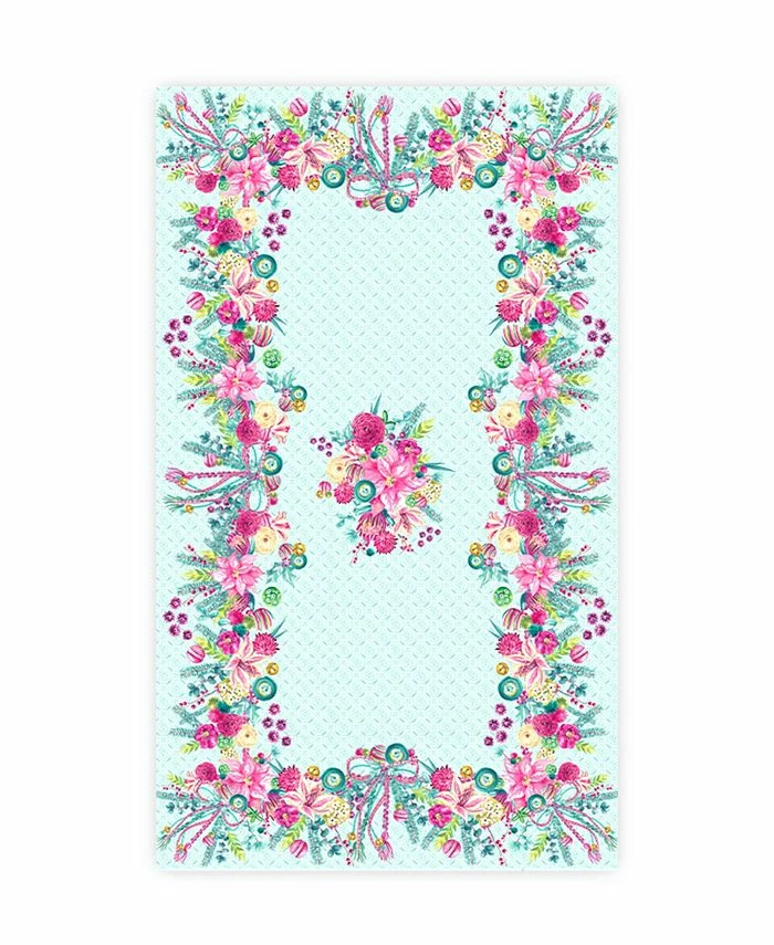 Out with the old, in with the new this holiday design “Boho Christmas” tablecloth, features a watercolor floral arrangement in magenta, pink, red, and green hues. The centerpiece of poinsettias, ornaments, and holiday greenery is the perfect addition to the tone-on-tone mint trellis background.