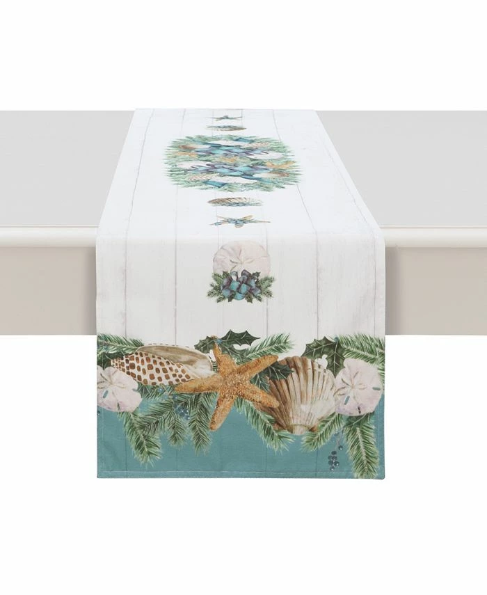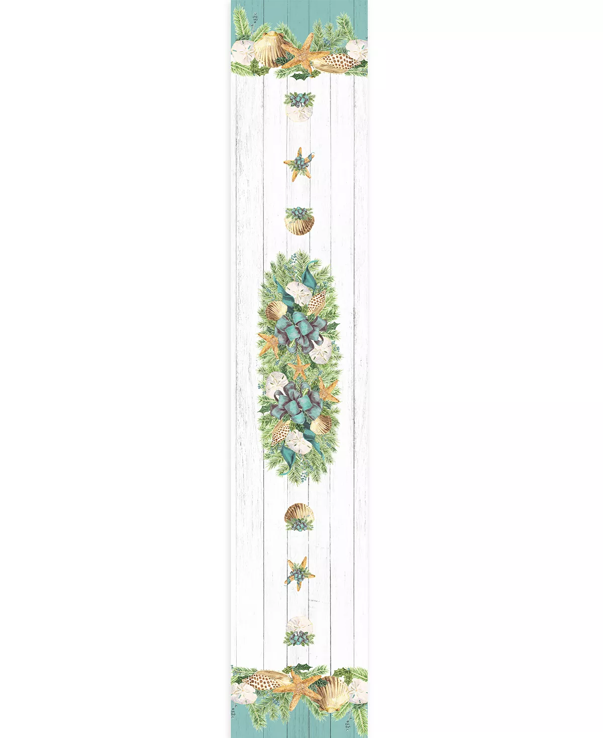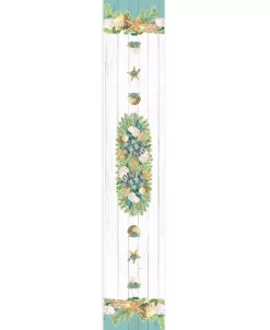 This soft to the touch “Christmas By The Sea” runner is an excellent way to have coastal flair to your Christmas table setting. Christmas by the sea features soft yet bold blue hues. Shiplap flairs sea shells hang like with garland elegantly bringing the true feeling of Christmas by the sea.
