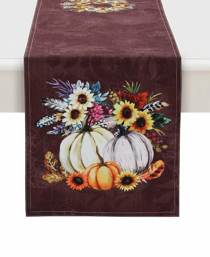 “Fall Feathers” reversible runner features jewel-toned watercolor flowers, sunflowers, pumpkins, and fun feathers. In the center are three elegant wreaths. The background contrasts the bright colors with a rich maroon-colored decorative pattern of line art flowers and floral silhouettes.
