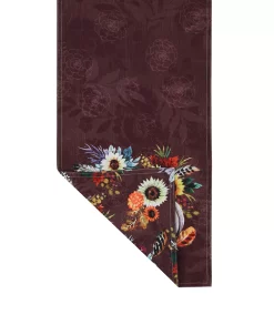 “Fall Feathers” reversible runner features jewel-toned watercolor flowers, sunflowers, pumpkins, and fun feathers. Positioned in the center are three elegant wreaths. The background contrasts the bright colors with a rich maroon-colored decorative pattern of line art flowers and floral silhouettes.
