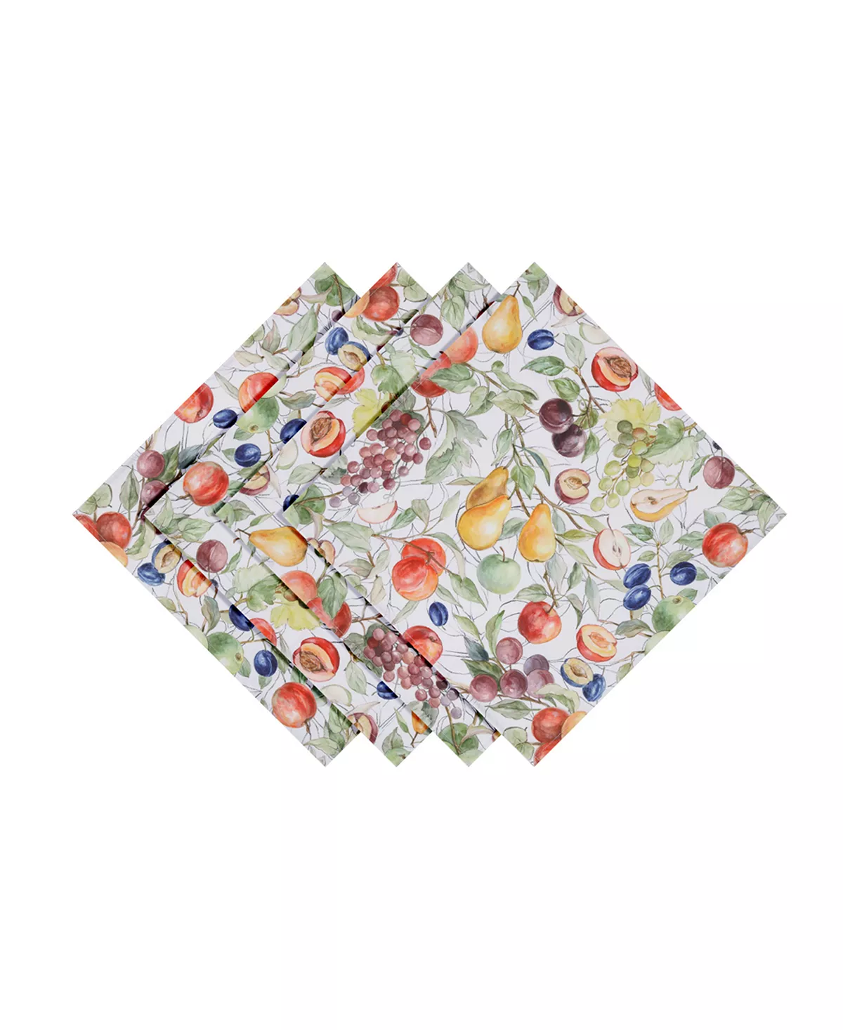 This food-inspired reversible napkin “In the Orchard” features an abundance of watercolor fruit, apples, peaches, plums, to name a few. Green leaves play off the rich colors of the fruit. Behind the fruit and leaves are line drawings of leaves scattered throughout the off-white background.
