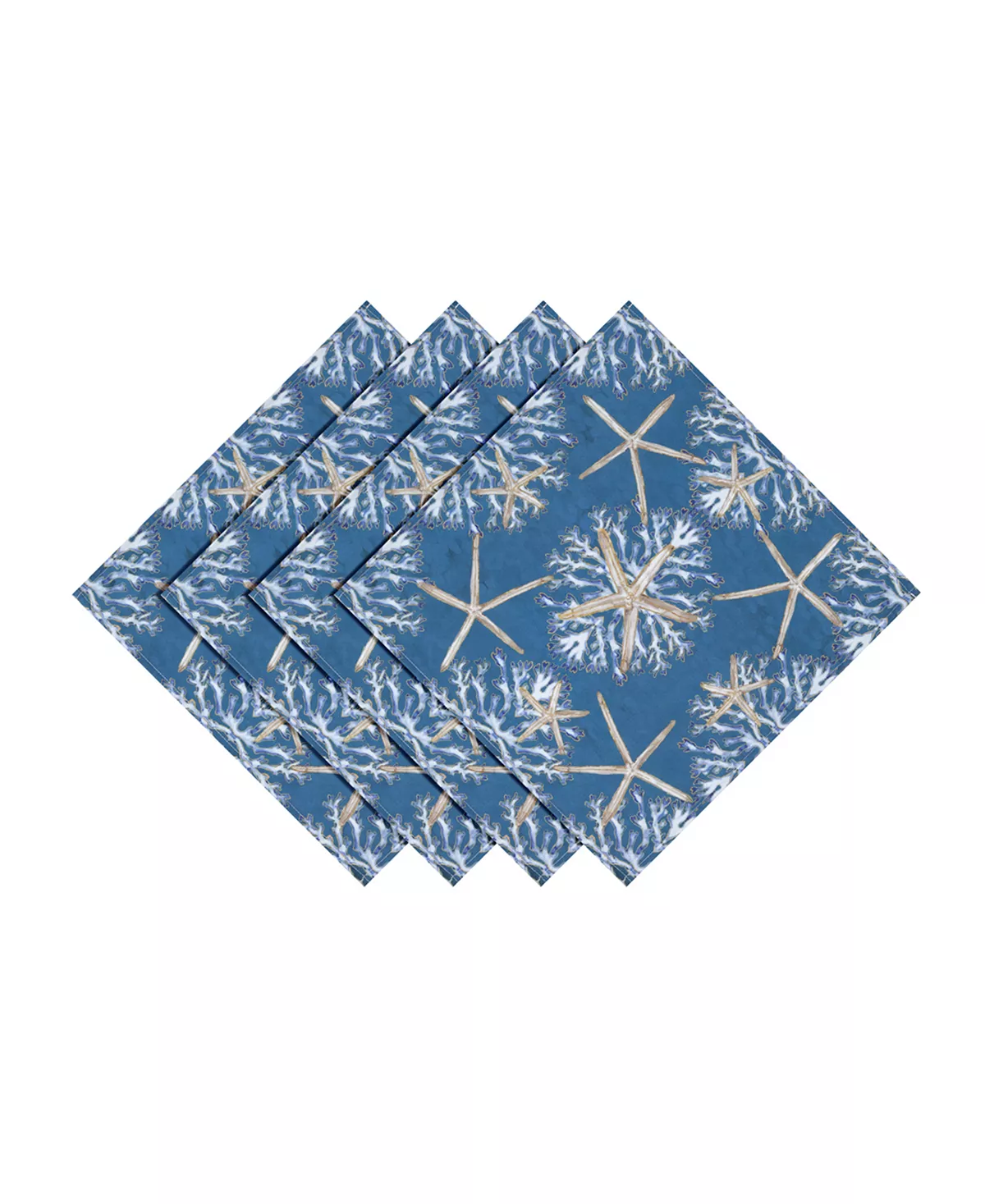 This coastal-inspired napkin “Playa Shells” is a classic look fit for any seaside escape. Featuring, delicate sea shells, sand dollars, starfish, and coral on top of a deep and rich blue background color. This napkin will add a special touch of elegance to your everyday table.