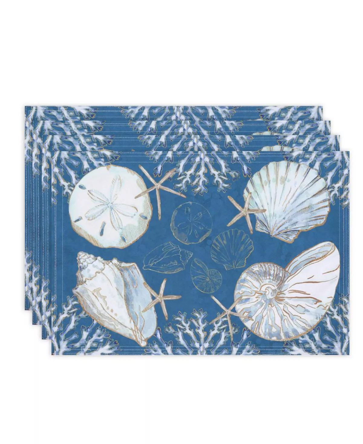 This coastal-inspired placemat, “Playa Shells” is a classic look fit for any seaside escape. Featuring, delicate sea shells, sand dollars, starfish, and coral on top of a deep and rich blue background color. This reversable placemat will add a special touch of elegance to your everyday table.