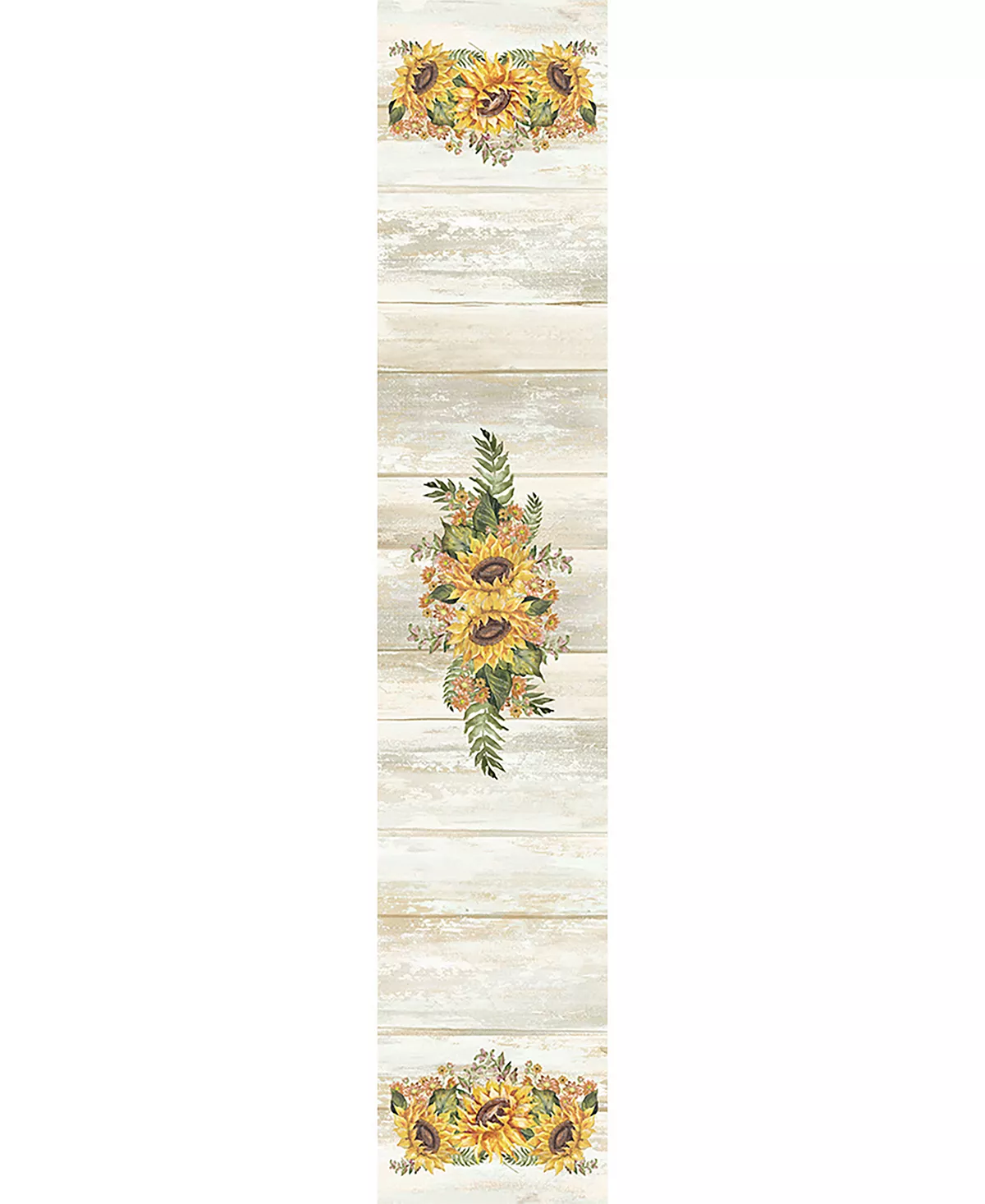 This floral themed runner, “Sunflower Day,” is a perfect way to create a fun rustic table setting. The design features hand painted sunflowers in warm yellow, brown, green hues with pink accent flowers against a wooden background. Add this beautiful, soft to the touch runner to any dining area.