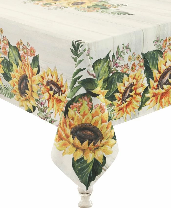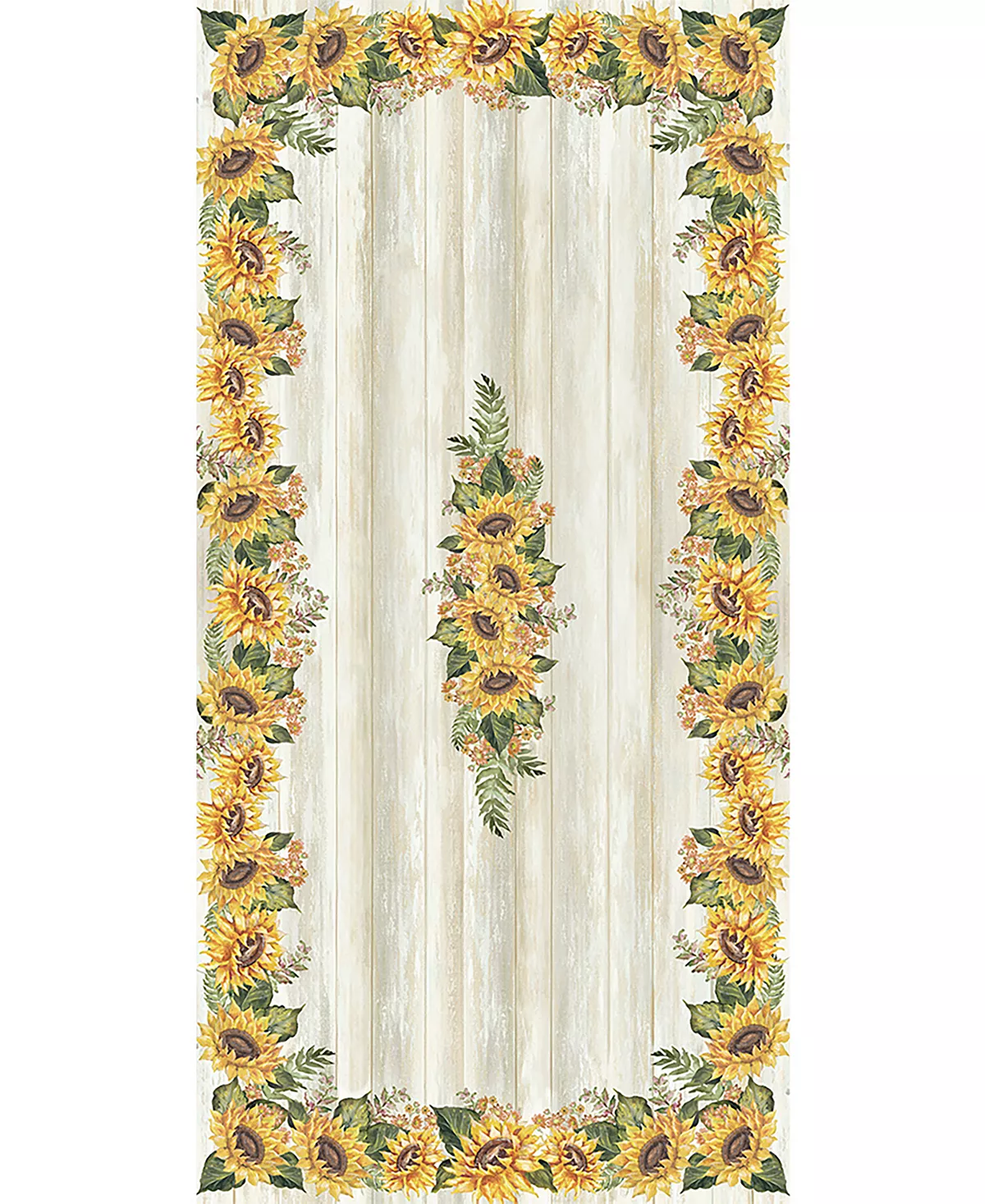 This floral tablecloth, “Sunflower Day,” is a perfect way to create a fun rustic table setting. The design features hand painted sunflowers in warm yellow, brown, green hues with pink accent flowers against a wooden background. Add this beautiful, soft to the touch tablecloth to any dining area.