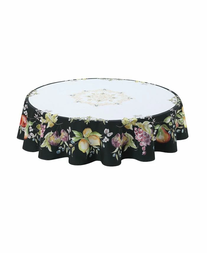 This food-inspired round tablecloth “Tuscan Fruit Sketch” features watercolor fruit, pomegranates, lemons, figs, pears, grapes, and a contrasting black background. In addition, the clean white center dazzles with a golden medallion as the focal point.
