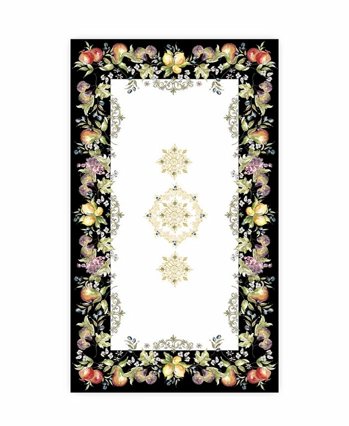 This food-inspired tablecloth “Tuscan Fruit Sketch” features watercolor fruit, pomegranates, lemons, figs, pears, grapes, and a contrasting black background. In addition, the clean white center dazzles with three golden medallions as the focal point.