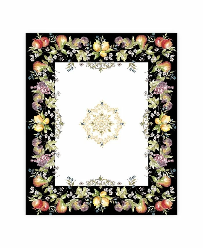 This food-inspired tablecloth “Tuscan Fruit Sketch” features watercolor fruit, pomegranates, lemons, figs, pears, grapes, and a contrasting black background. In addition, the clean white center dazzles with three golden medallions as the focal point.