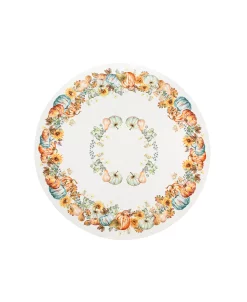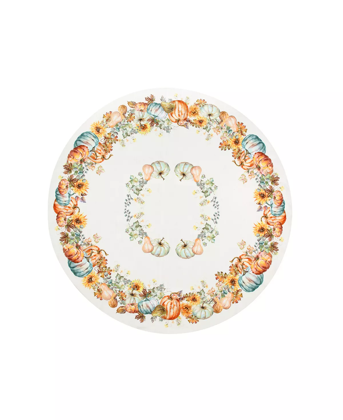 This “Harvest Sun” round tablecloth is an excellent way to evoke a warm harvest table setting. Harvest Sun features soft warm hues that create a cozy feeling. Elements of sunflowers, pumpkins, gourds, and leaves on the round tablecloth are perfect for a casual dinner party or a formal event.
