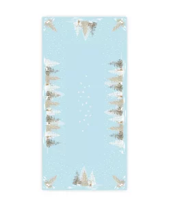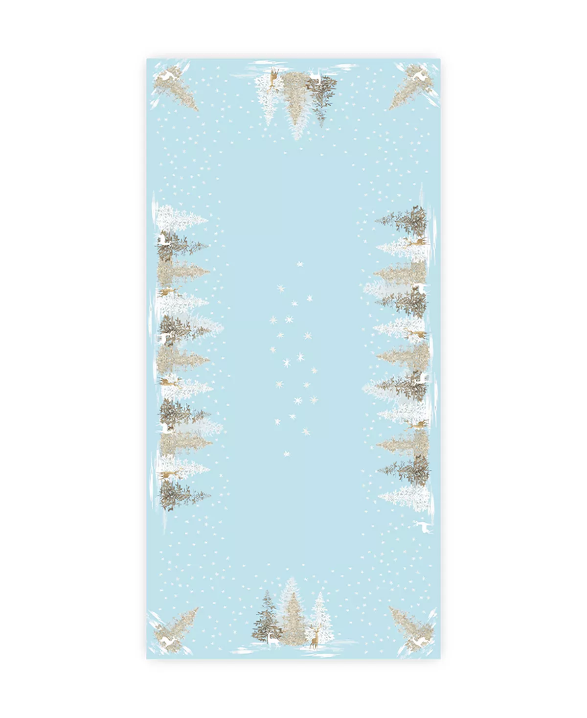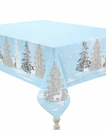 This seasonal-themed tablecloth, “Winter Wonderland” features an elegant wintertime scene. Gold-tone and white colors highlight deer and pine trees, set against an icy blue background and falling snow. Add this beautiful design to your table for the perfect seasonal look.