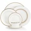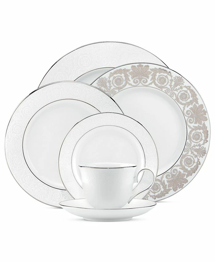 Fine dining will flourish with Artemis dinnerware from Lenox. A raised floral pattern and wide bands of sumptuous platinum in white bone china embody classic elegance.