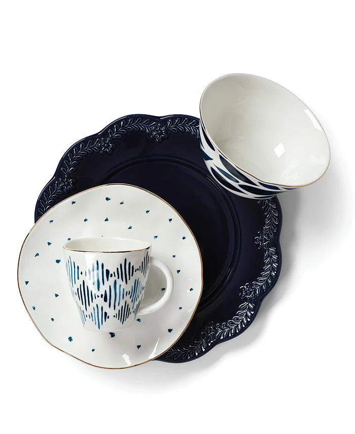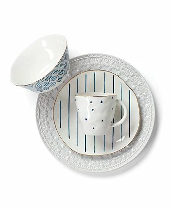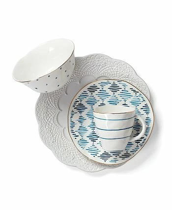 Blue Bay is a dessert story with a great hand-thrown pottery feel. This collection is made up of 4 whimsical, eclectic blue and white patterns that play perfectly together in assorted sets of four: Tid-bit plates, dessert plates, mugs, espresso cups/saucers, all-purpose bowls and dessert bowls. Layered in is a Teapot, sugar and creamer set and various trays to accommodate all of your entertaining needs. We incorporated wood for warmth and that artisan quality, plus a glimmer of microwave safe gold for everyday performance and presentation.