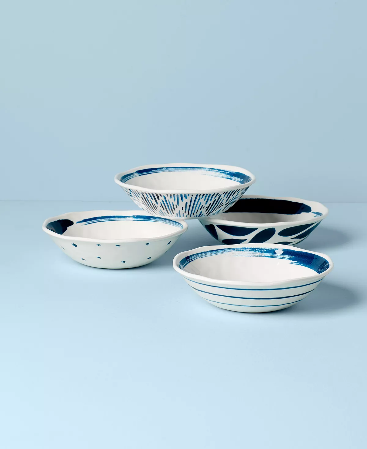 Organic shapes and artisanal designs merge flawlessly on these Blue Bay all-purpose bowls. Made from hardworking melamine, the lightweight set stands up to kids, poolside parties, and daily duty with carefree ease befitting boho style.